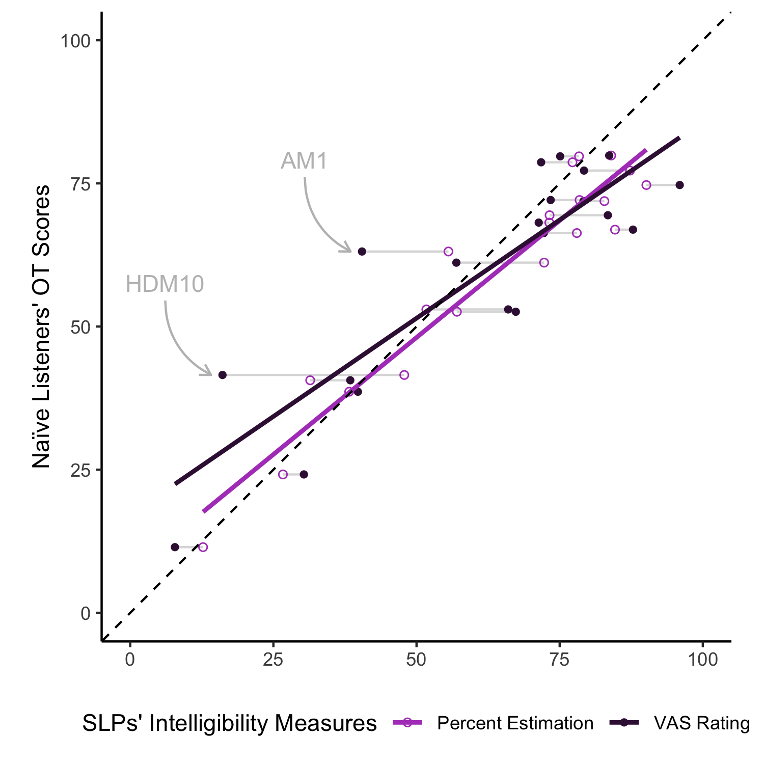 The most challenging part of this project was the design of the experiment protocol. We decided to compare SLPs’ VAS ratings and percent estimations of intelligibility to naive listeners’ orthographic transcriptions, as orthographic transcriptions from naive listeners are often considered the most objective measure of intelligibility. However, this required us to use different experimental protocols for the two listener groups. Because of this decision, we needed to aggregate the SLPs’ intelligibility ratings and the naive listeners’ transcriptions per speaker to compare the ratings across listener groups. This design prevented us from looking at individual responses using hierarchical linear modeling. However, we will do this in future work!